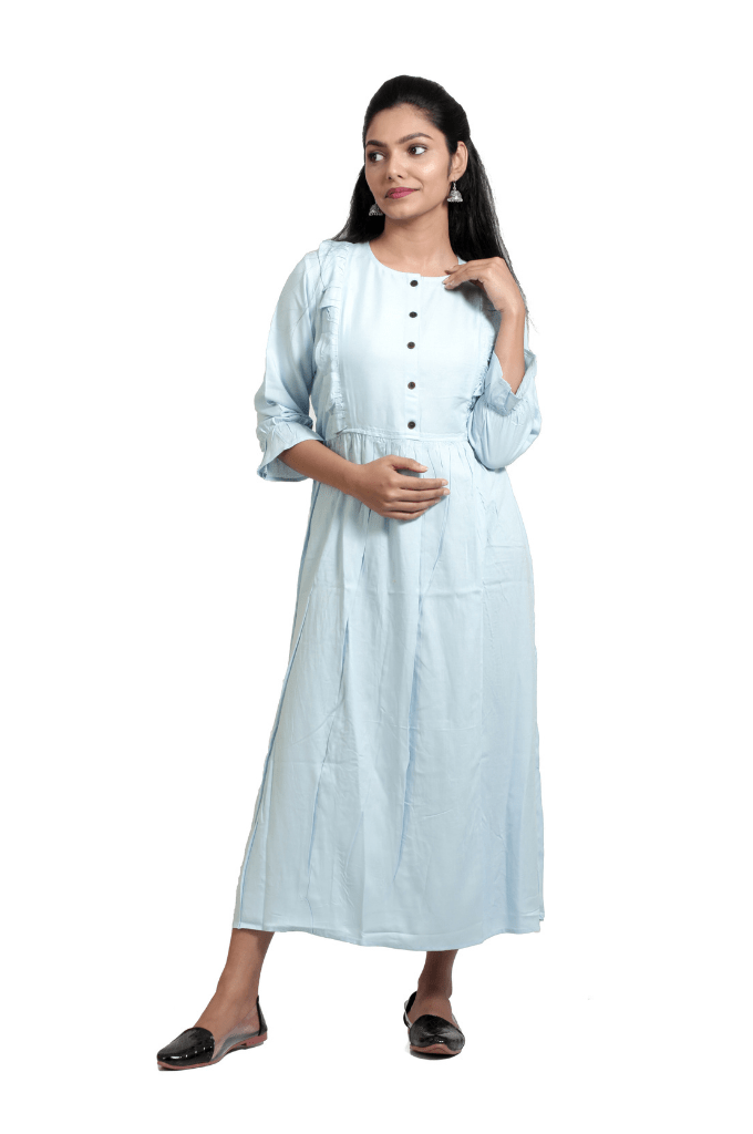 - A contemporary long dress with stylized ruffled yoke and front open plain light blue color long top.