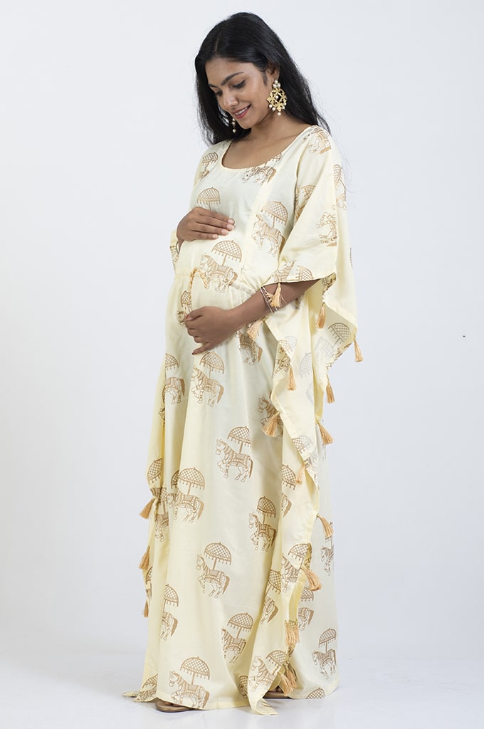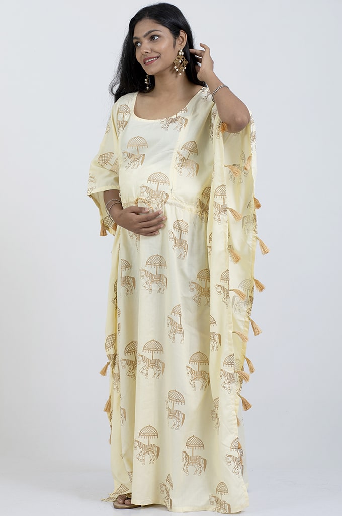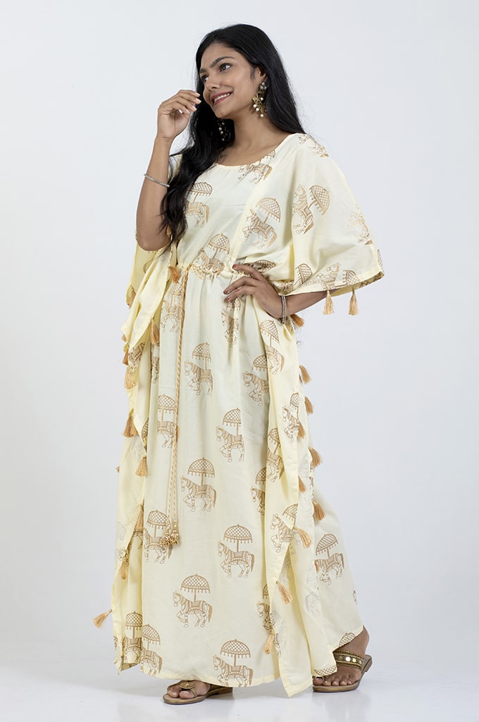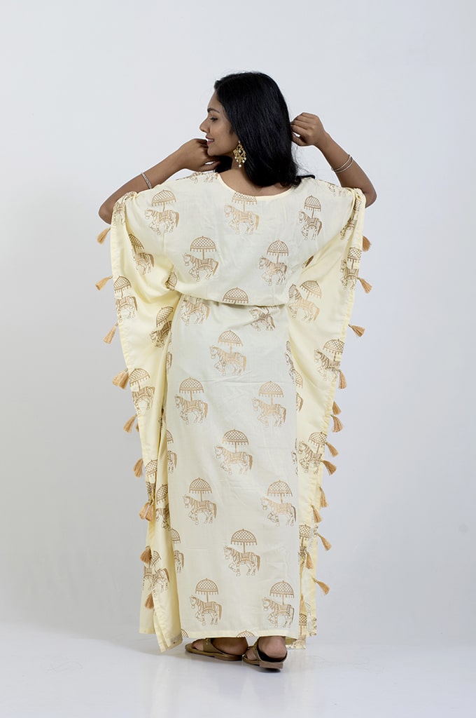 - Breezy Rayon kaftan with tassels add an extra charm to this outfit.
